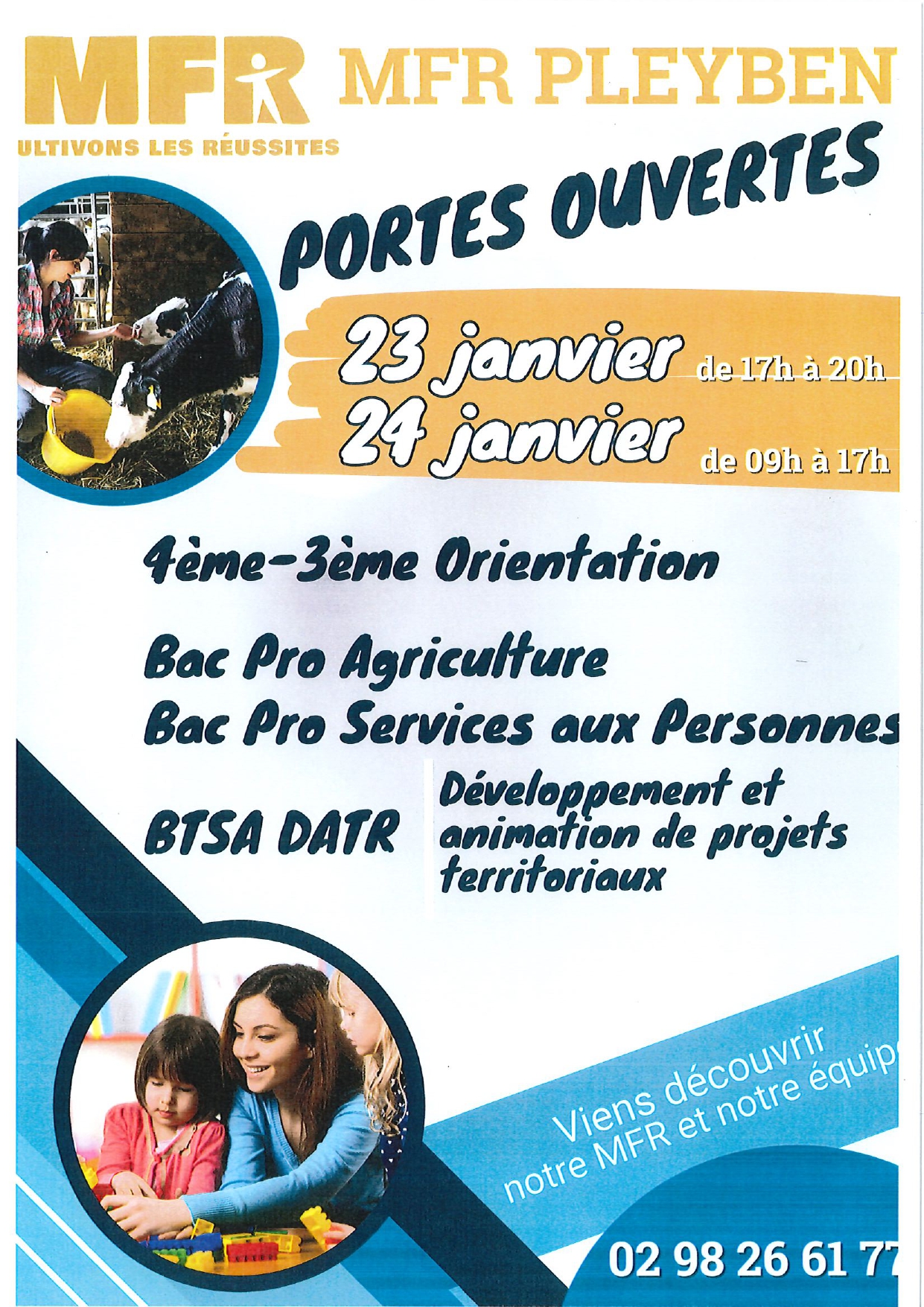 - Les supports professionnels à la Maison Familiale de Pleyben après les classes de 4ème et 3ème (classe de 2de) sont l'agriculture, spécialité à dominante élevage (bovins lait, bovins viande, porcs, volailles) et Services aux personnes (santé, social, animation, petite enfance, personnes âgées, restauration collective, tourisme rural, aide à la personne).